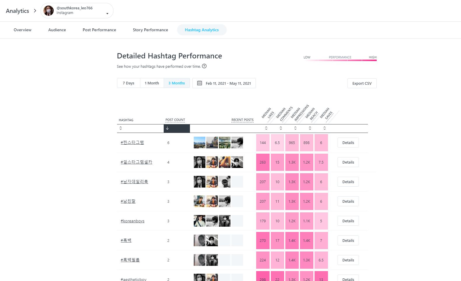 저 화면은 포스팅 숫자로 정렬을 한 것인데, 보다시피 #찐스타그램이라는 태그가 들어간 사진은 총 6개가 있고 옆에는 그 중 최근 네 개 게시물이 보여진다. 바로 이 기능을 통해 어떤 해시태그가 평균적으로 좋아요와 댓글이 많이 달리는지, 노출과 도달률이 높은지, 저장이 많이 되는지 확인할 수 있는 것이다.