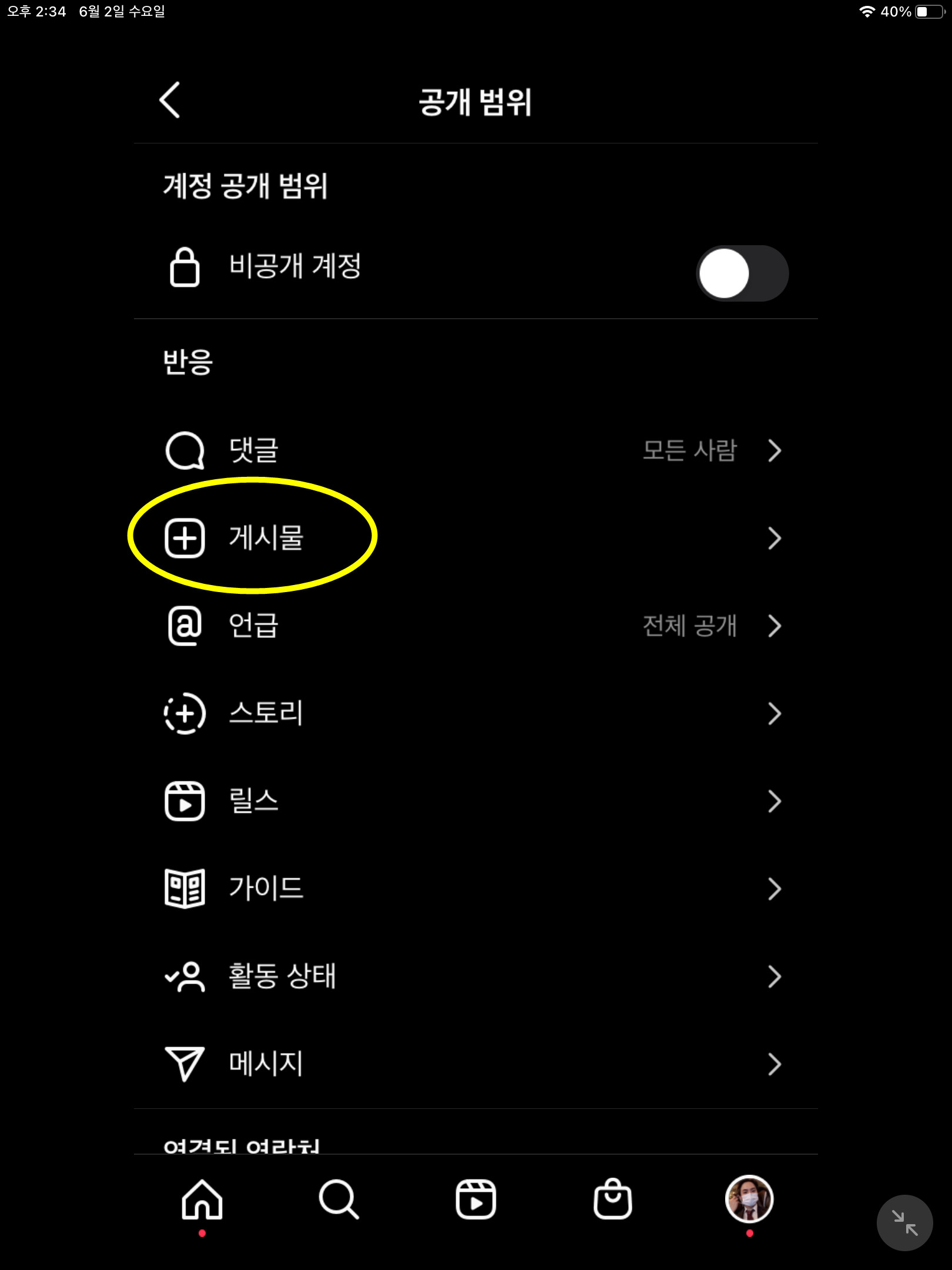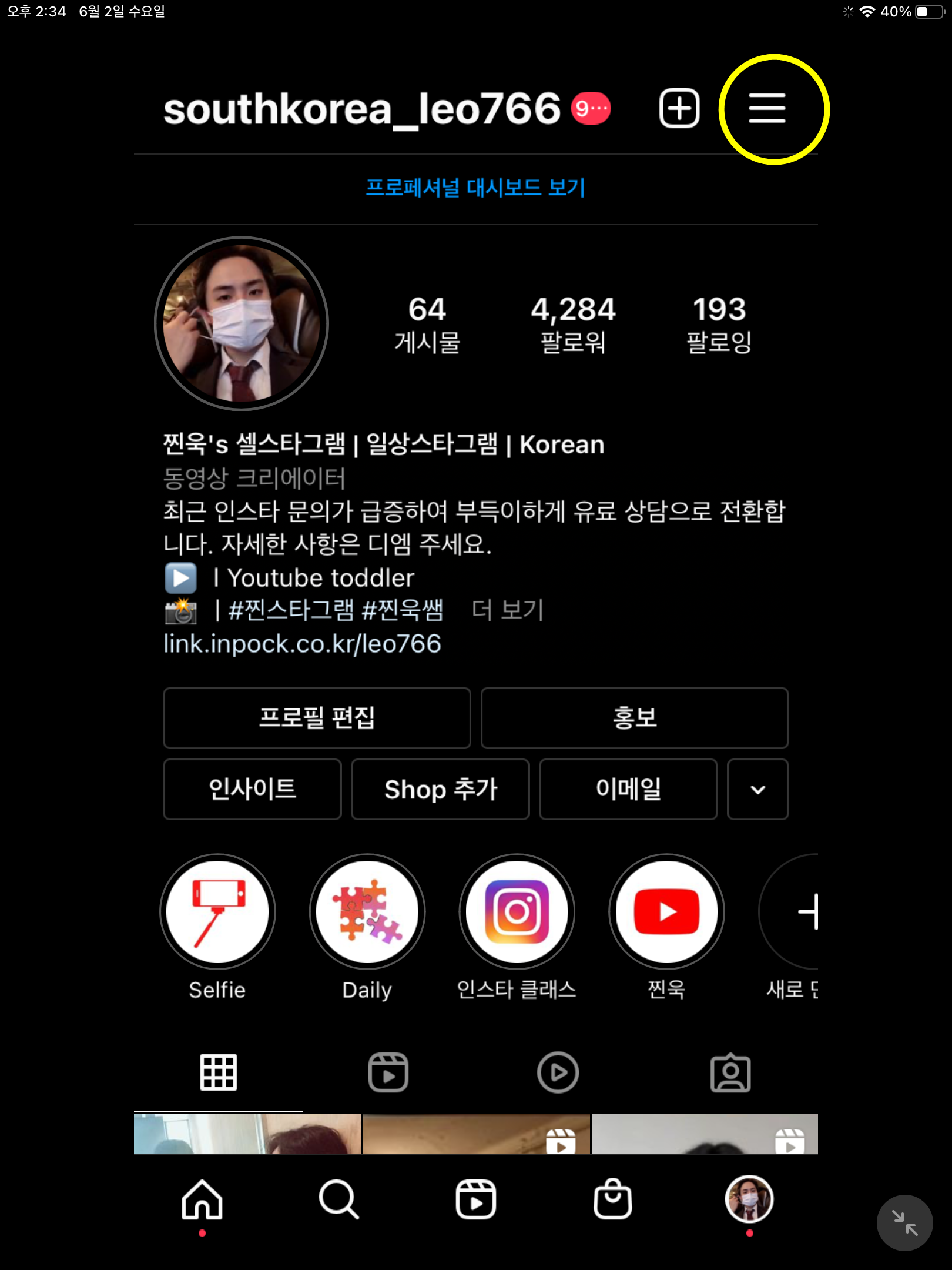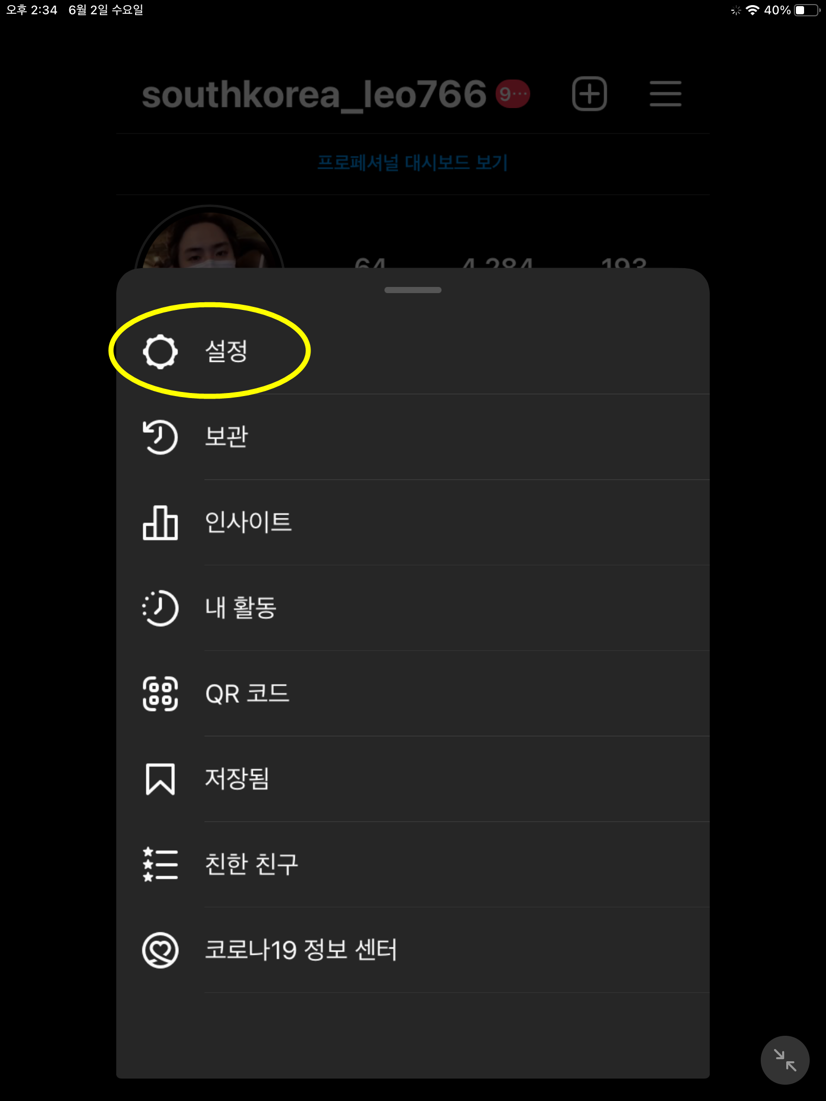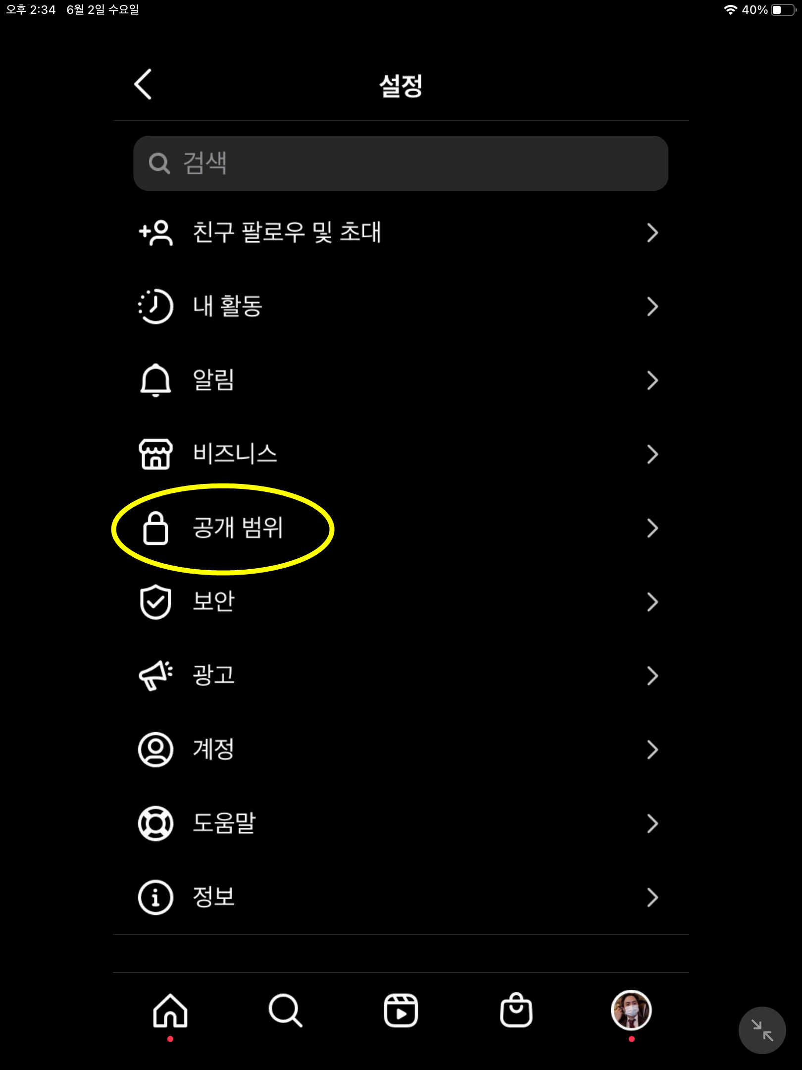 먼저 계정 전체에 적용하는 방법을 보여드리겠다. 내 프로필로 가서 사진 순서대로 따라하면 된다.