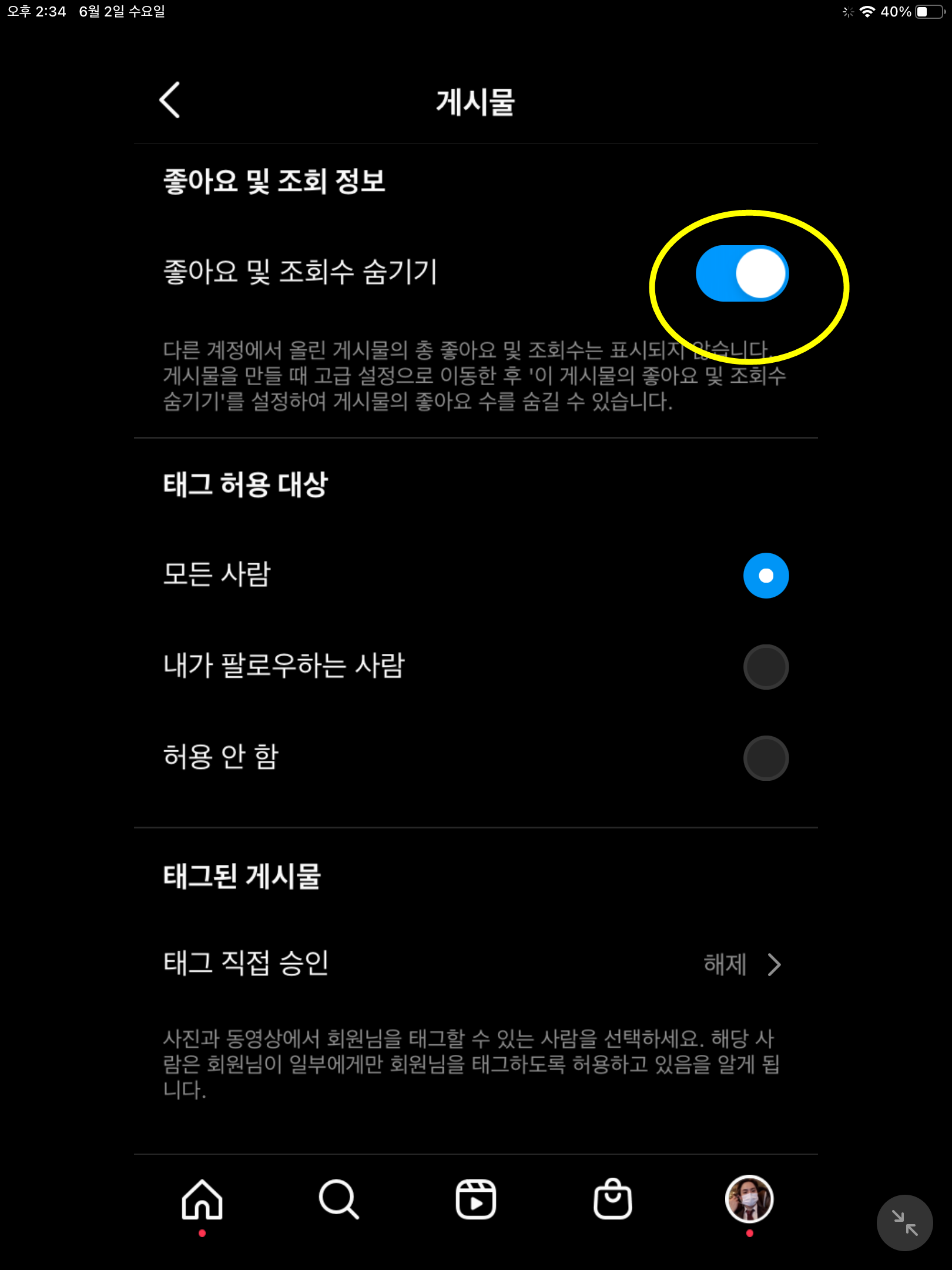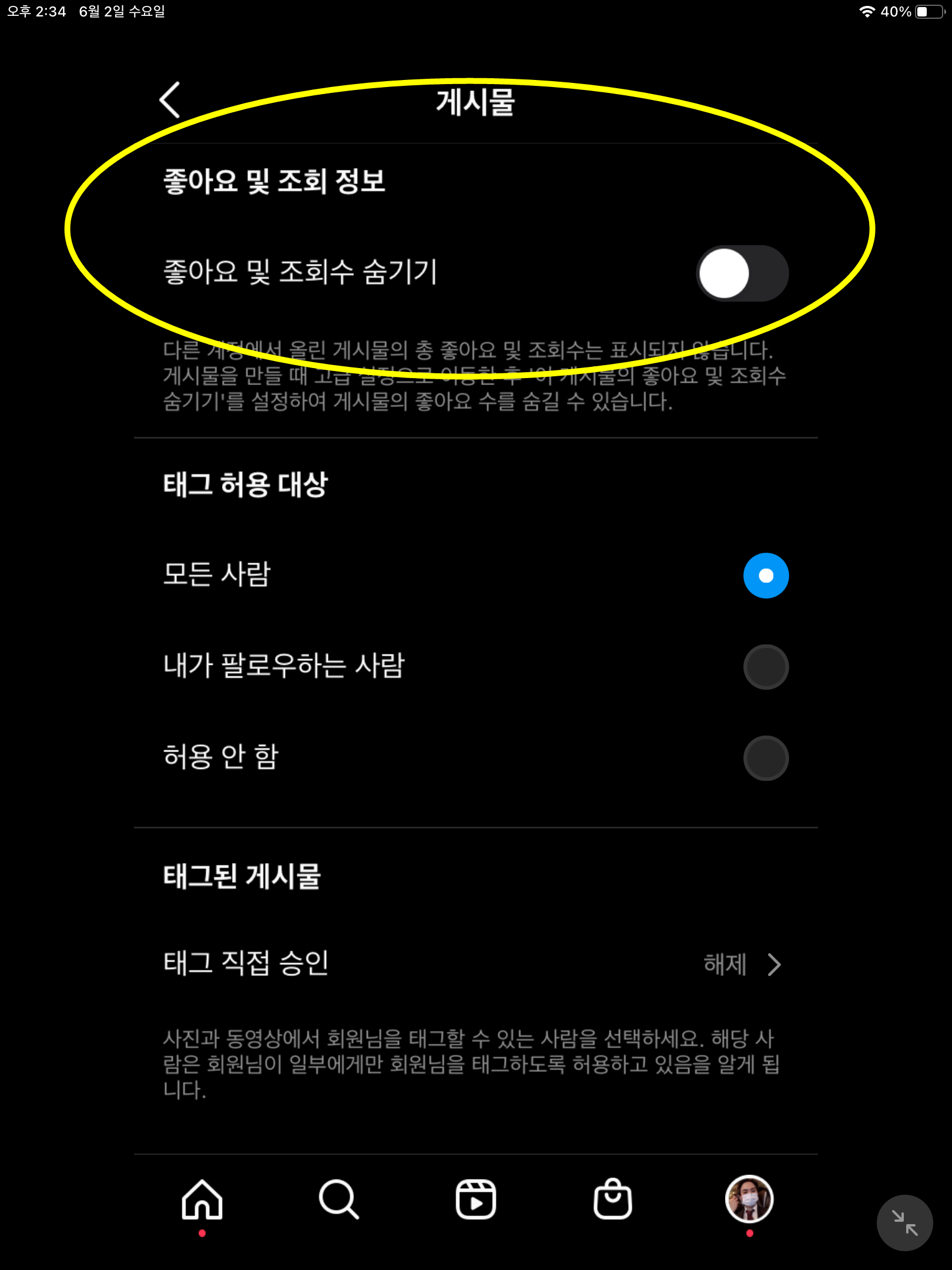 두 번째 방법은 내가 올리는 특정 게시물의 좋아요만 숨기는 것이다.