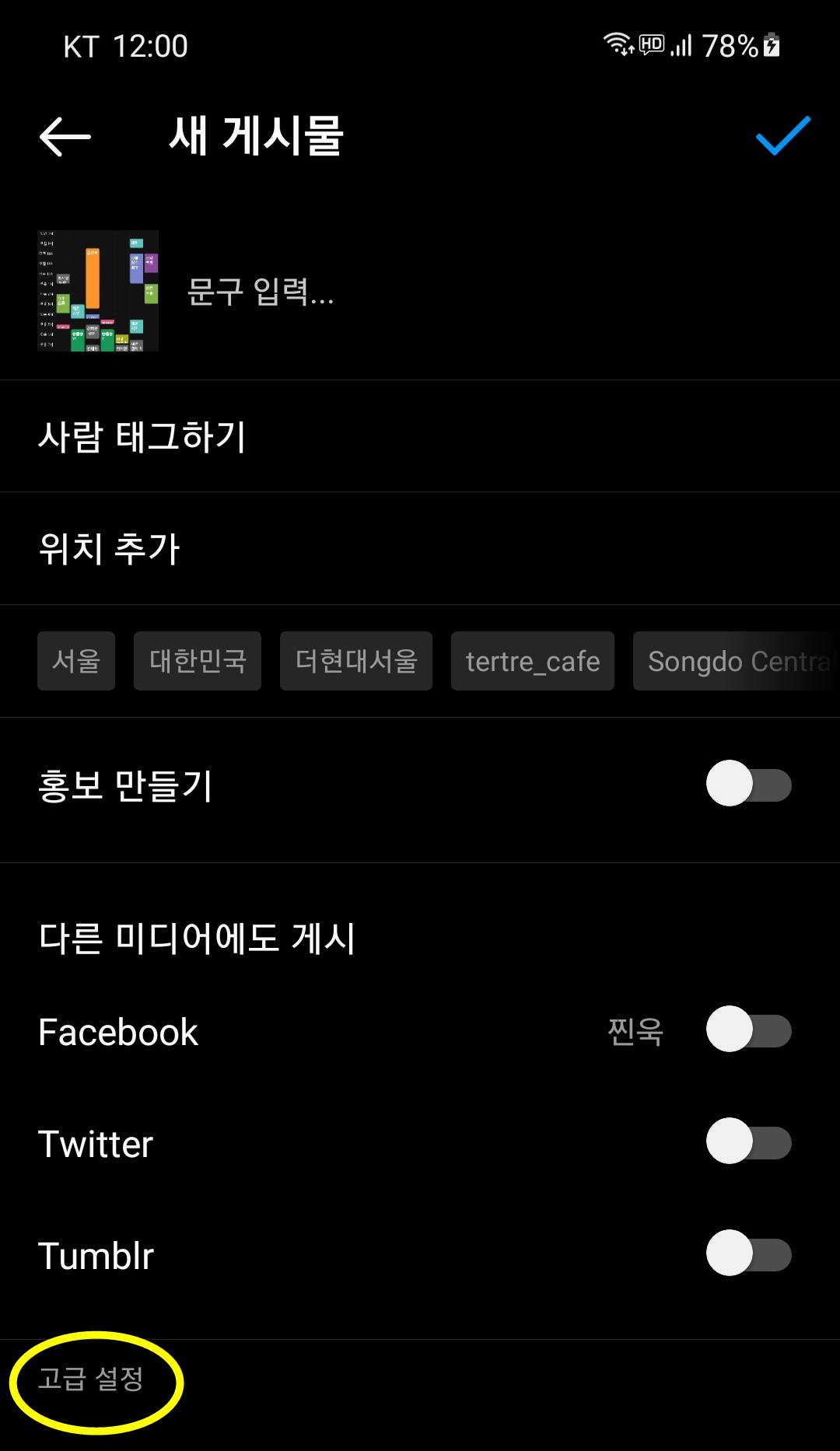 평소처럼 게시물을 올리다가 위와 같은 화면이 뜨면 밑에 고급설정을 눌러라. 그러면 좋아요 숨기기 버튼이 보일 것이다. 이렇게 하면 해당 게시물의 좋아요 수만 가려지기 때문에 다른 계정의 좋아요 수를 보는 데 문제가 없다.
