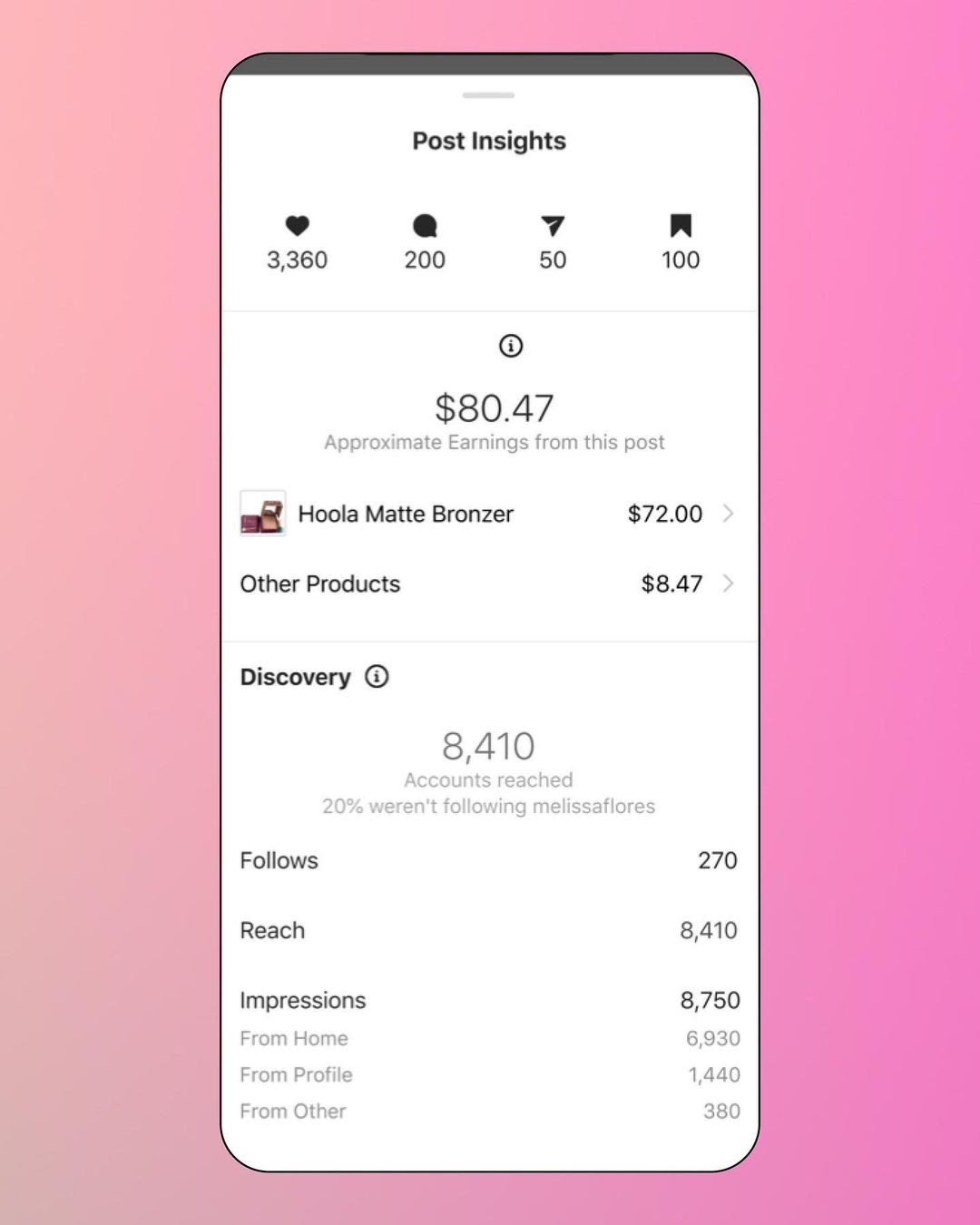일단 이 기능은 미국을 시작으로 몇몇 브랜드와 유명 크리에이터에게 우선 적용된다. 그러나 인스타그램은 해당 기능을 더 많은 브랜드와 크리에이터들에게 확대할 것이라고 밝혔다. 따라서, 우리가 크리에이터든 브랜드든 인스타를 더 열심히 해야 될 이유가 생겼다. 팔로워는 이제 곧 돈이기 때문이다. 뭐 이미 전부터 그랬지만, 이제 대놓고 돈이다. 인스타에서는 크리에이터를 위해 해당 기능에 대한 수익 데이터도 제공한다.