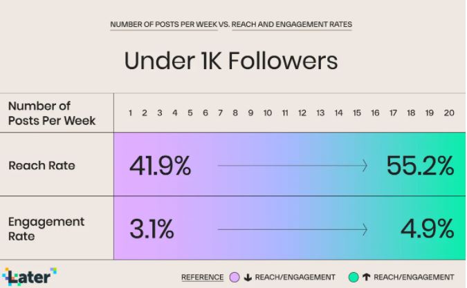 만약 내 목표는 새로운 사람에게 도달하는 게 아니라 각 포스팅에 좋아요와 댓글이 더 많이 달리는 것이라면, 팔로워가 천명 이하인 경우 하루 평균 2회 포스팅 하는 것이 가장 좋고, 팔로워가 천명을 넘을 경우 주 1회만 포스팅하는 것이 가장 좋다.