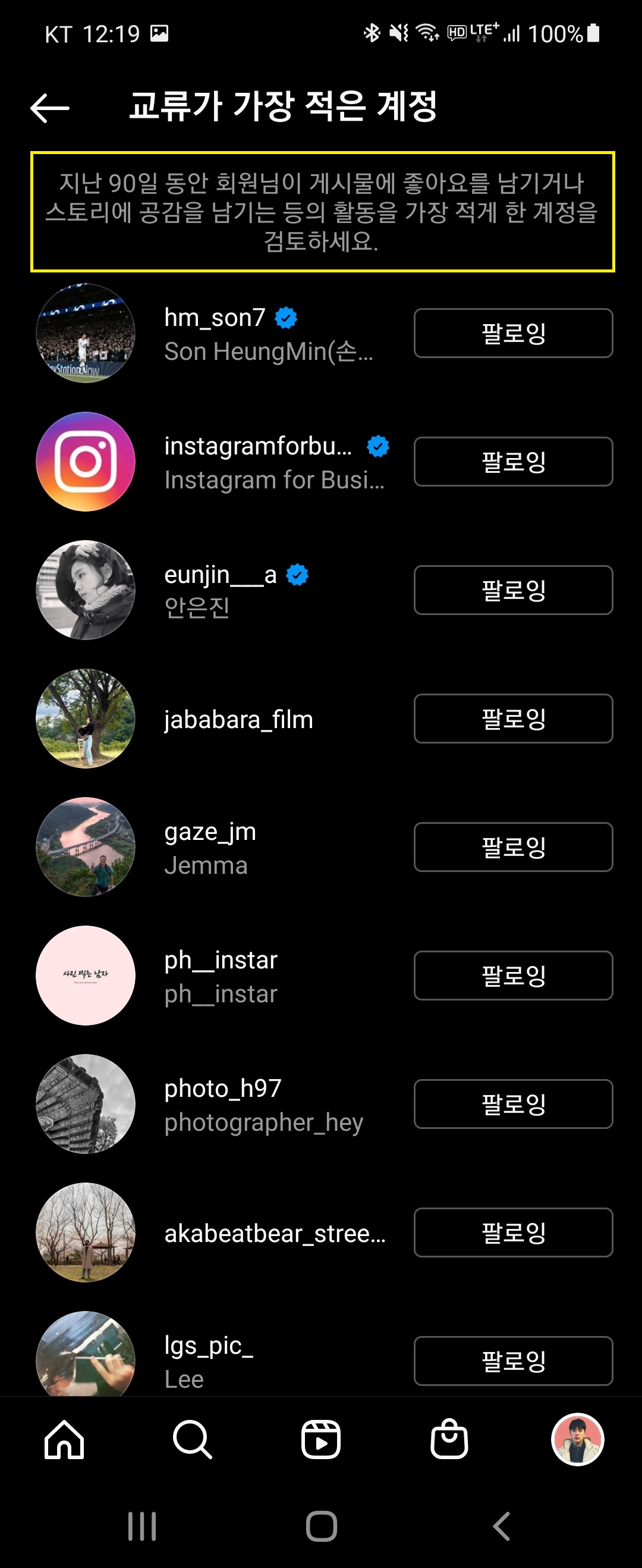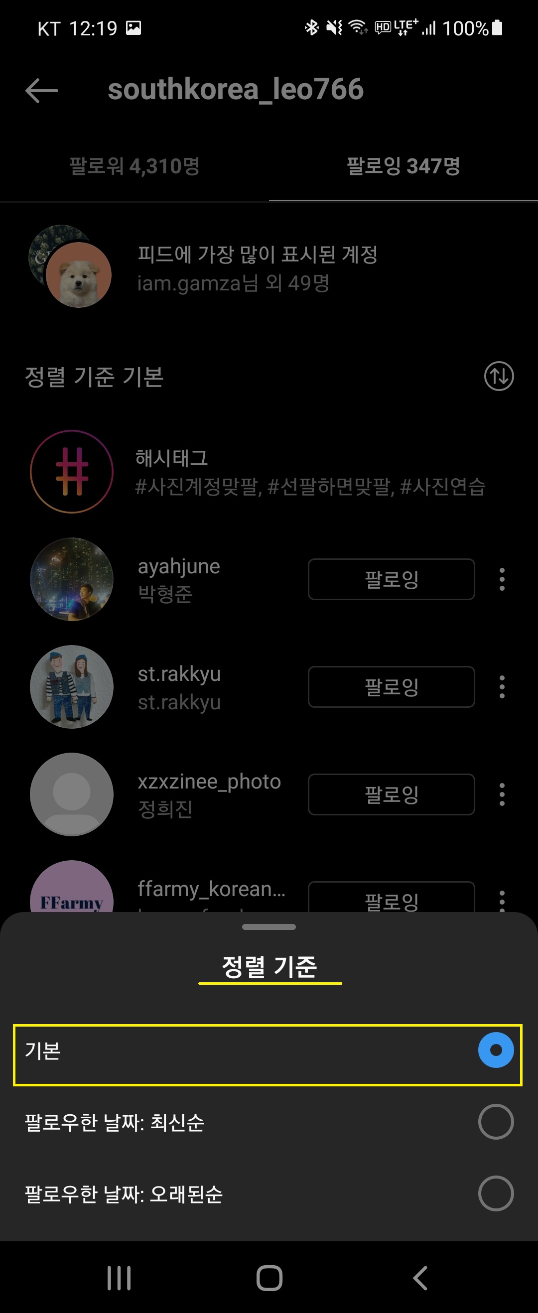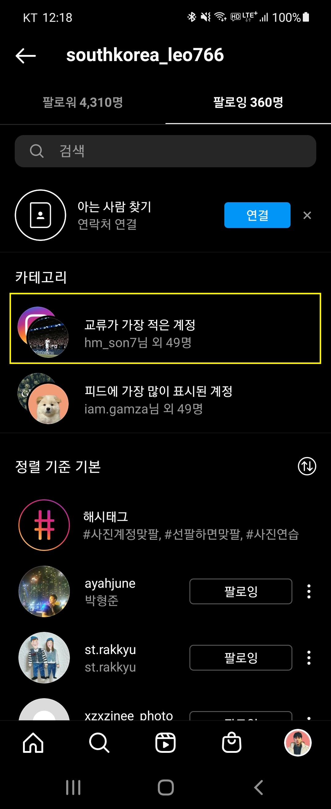 똑같이 프로필에서 팔로잉 숫자를 누르고, 교류가 적은 계정을 지나 밑으로 내리면 내가 팔로잉하는 계정들이 쭉 뜨는데 여기서 정렬 기준이 기본으로 돼 있는지 다시 한번 확인하자. 기본으로 했을 때 내 계정에 관심이 많은 계정이 위에 뜬다고 생각하면 된다. 그럼 반대로 스크롤을 가장 아래로 내리면?