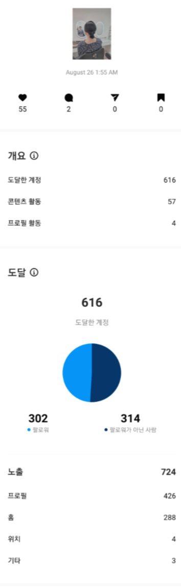 좋아요 55, 노출 724, 해시태그 노출은 없다. 해시태그 노출이 있는 게시물들도 50미만의 아주 저조한 노출을 보이고 있었다. 노출도 보면 724지만 프로필 노출이 426이라는 얘기는 다른 게시물을 보고 이 계정에 들어와서 이후에 보게 된 경우가 많다는 것이기 때문에, 사실 컨설팅을 받기 전에는 노출이 더 낮았다.