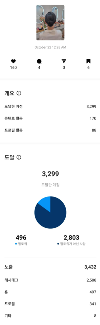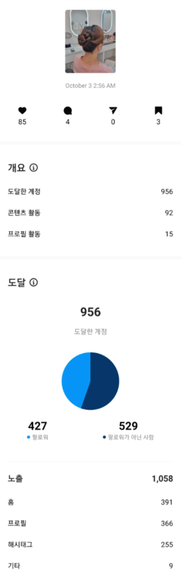 일단 좋아요 수가 30개 정도 늘었고, 노출이 1,000을 넘었다. 그리고 무엇보다 중요한 건 해시태그 노출이 255 발생했다는 것이다. 이 정도 수치면 50만 미만의 작은 태그에서 인기게시물에 갔을 것이다.