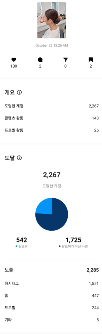 좋아요 수는 140, 160개 정도로 늘었고, 무엇보다 해시태그 노출이 1550, 2500정도로 엄청난 증가를 보였으며 전체 노출량은 처음과 비교하면 3~5배가 늘었음을 알 수 있다. 첫 게시물은 오래 돼서 프로필 노출 값이 높기 때문에 프로필 노출값을 감안하면 실제 증가율은 더 높다고 볼 수 있다.