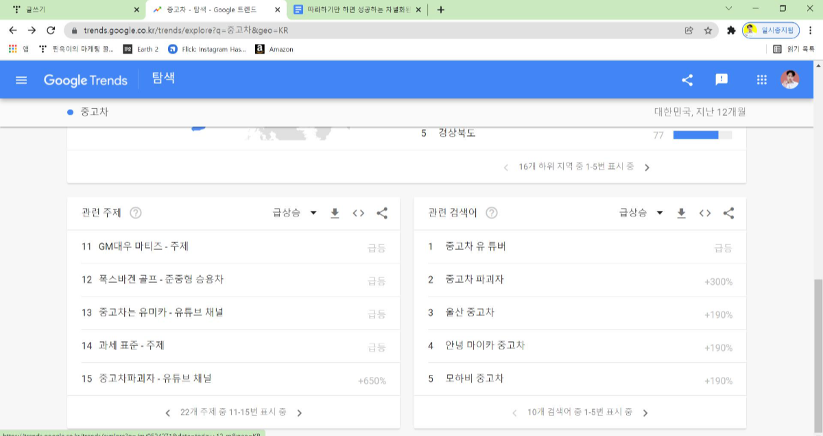 중고차를 검색한 화면에서 아래로 쭉 내리면 관련 주제, 관련 검색어가 나온다. 여기서 페이지를 넘기면서 아이디어를 얻을 수있다. 인기순 보다는 급상승 순으로 정렬하는 것을 추천한다. 왜냐하면 사람들이 찾는 양에 비해 정보는 부족할 확률이 높기 때문이다. 예를 들면 위 화면에서는 '과세 표준'에서 아이디어를 얻어 중고차 차급별 과세 표준에 대해 포스팅을 만들 수도 있고, 조금 더 머리를 굴리면 중고차 파괴자나 중고차는 유미카 같은 유튜브 채널에 들어가서 그 채널들이 왜 인기를 얻고 있는지 분석해서 해당 요인을 내 포스팅에 반영할 수도 있다. (모방이 아니라 벤치마킹이라고 하자)