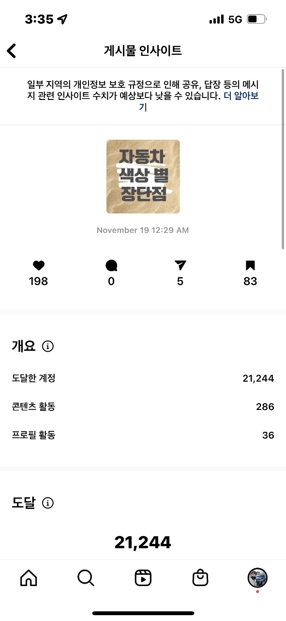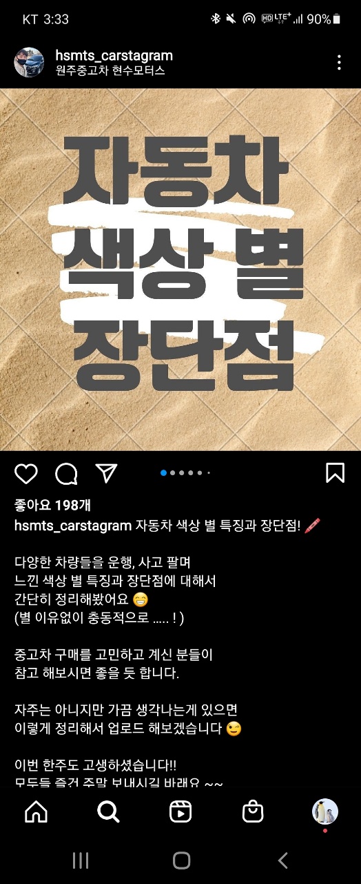 인사이트를 보면 알겠지만, 이 분은 나와 컨설팅하고 올린 첫 게시물 부터 소위 대박이 났다. 솔직히 말해서 미적으로 훌륭한 디자인의 정보성 콘텐츠는 아니다. 그렇지만 좋은 정보의 힘은 때론 아름다움보다 강력하다. 개인적으로 자동차에 관심이 많아서 자동차 관련 유튜브나 블로그 글을 많이 봤지만, 색상별 장단점을 정리한 글은 난 처음 봤다.