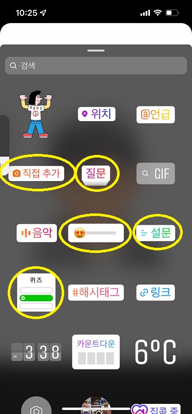 동그라미 친 5개의 스티커를 활용했을 때 가장 참여율이 좋다. 실험 결과 그 중에서 베스트는 [설문]이었다. 아무래도 YES/NO로 두 개의 선택지를 주니 사람들이 쉽게 참여하는 것 같았다. [직접 추가] 기능은 모르는 사람이 많은데 다른 스티커에 비해 참여율이 높은 편은 아니지만 예를 들어 내가 사진 계정인데 올해의 베스트샷을 추가해주세요 라는 글과 함께 저 기능을 쓰면 내 스토리를 본 사람들이 자신의 베스트샷을 추가해서 공유하게 되는 재밌는 기능이다.