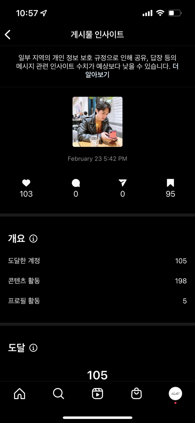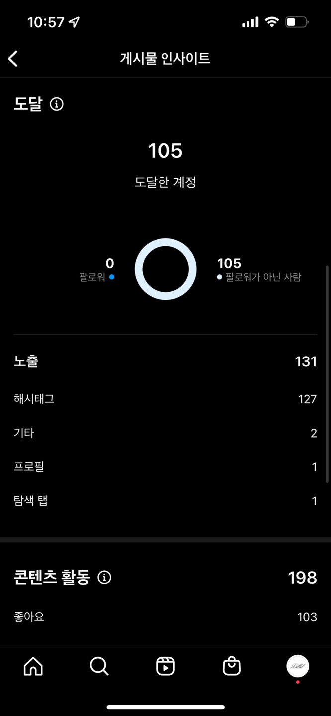 정확히 기억은 안 나지만 내가 잠입한 방에는 약 100명 정도의 사람이 있었고 95명이 품앗이 활동에 참여했다. 좋아요 수는 103개로 그것보다 많은데 이 좋아요 수는 #셀카투척 이라는 태그에서 약간 얻은 것으로 추정된다. 그 다음 해시태그 노출을 보면 127인데 중복된 숫자를 감안하고 봤을 때 저장 수 95와 큰 차이가 없을 것으로 생각된다. 즉, 단시간 동안 좋아요와 저장을 약 100개나 작업했지만 #셀카투척 이라는 태그에서 인기게시물에 가지 못했다는 것이다. 물론 셀카투척이 완전 작은 태그는 아니다. 그러나 작은 태그로 실험해도 결과는 동일할 거라고 생각한다. 궁금하면 1000~3000정도의 작은 태그로 실험을 해봐도 좋다.