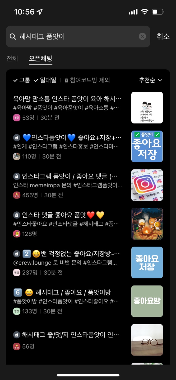 이런 진화된 방식 외에도 카카오톡 오픈채팅에서 인스타그램 품앗이를 검색하면 서로 좋아요나 댓글을 달아주고 인증하는 원초적 방식의 품앗이가 많이 있었으며 아직도 여전히 남아있다.