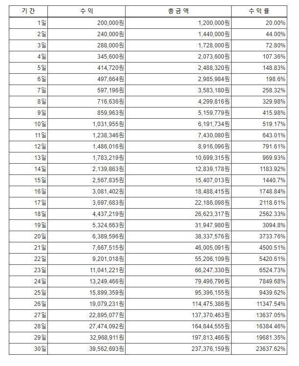 이 글의 목적은 매일 20%씩 안정적인 수익을 내서 복리 효과를 누리는 것이다. 100만원을 매일 20%씩 수익만 내도 한 달만에 2억 4천이 된다. 궁금하면 “복리 계산기” 검색해서 입력해봐라.