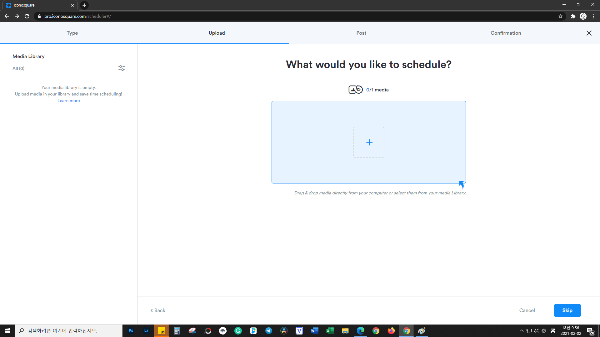 Photo를 클릭하면 다음과 같은 화면이 뜬다. 포스팅하고자 하는 사진을 드래그앤드롭해도 되고, + 를 눌러서 직접 찾아도 된다. 사진 편집을 보통 스마트폰 어플로 하는 사람들은 카카오톡 나에게 보내기로 사진을 미리 보내놓는 것을 추천한다. 원드라이브를 이용할 수 도 있지만 난 카톡이 더 편한 것 같다.