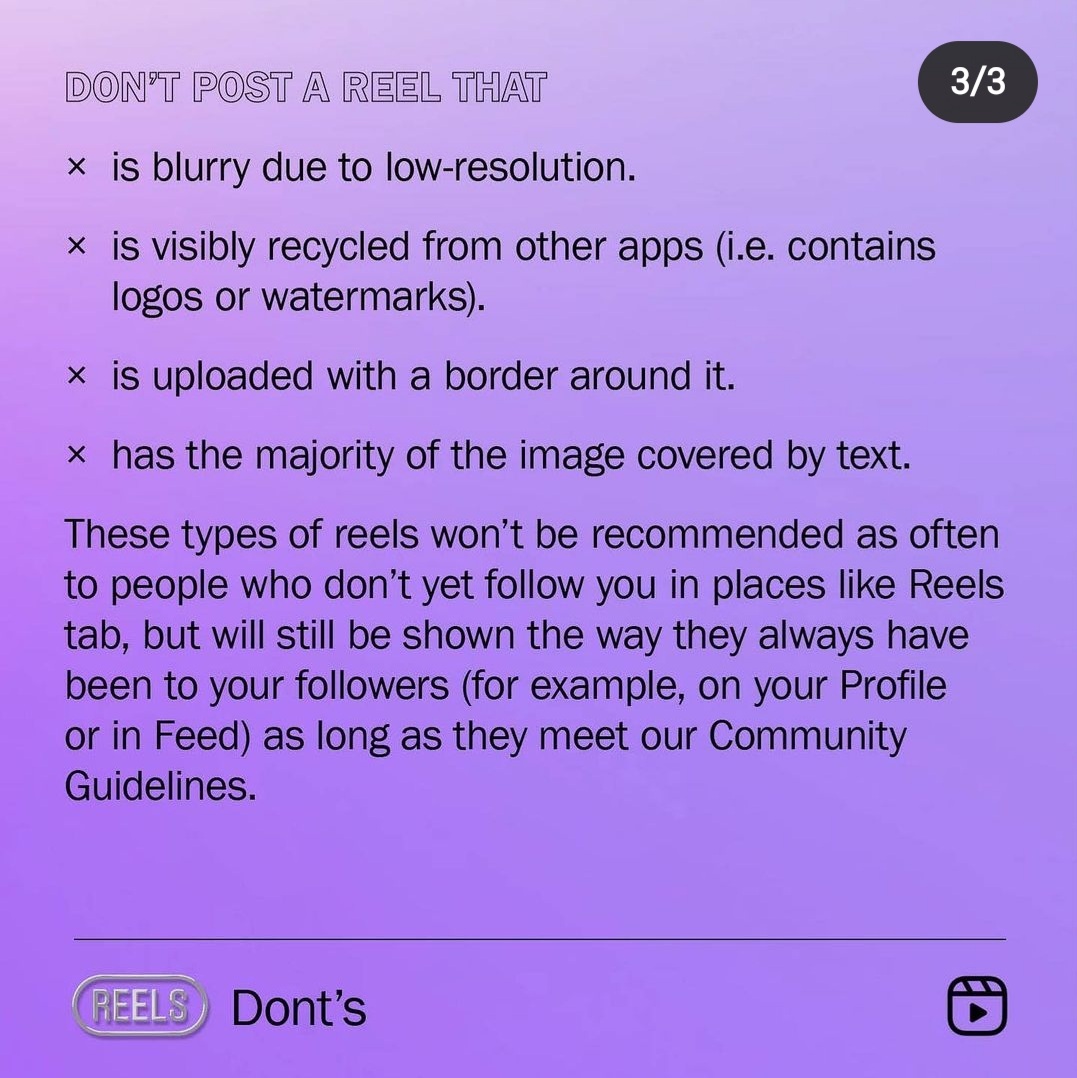 인스타그램은 아주 친절하게 우리가 이것들을 진짜 하면 안 되는 이유를 써 놓았다. 가이드라인에 위배 되지 않는 다면 이러한 하지 말라는 것을 한 게시물들이 팔로워들에게는 보여지겠지만, 릴스 탭과 같은 추천 알고리즘에는 올라가지 않는다고 대놓고 말하고 있다. 당연히 해시태그로 검색했을 때 최상단 릴스 자리에 노출될 일도 없다. 여기서 가이드라인이란 음란, 폭력과 같은 선정적인 영상만 아니면 된다는 뜻이다. 그런 영상을 올릴 일은 없겠지만, 공들여 찍은 멀쩡한 영상도 괜히 하지 말라는 거 해서 인기 게시물이 되지 않는 불상사가 발생하지 않기 바란다.